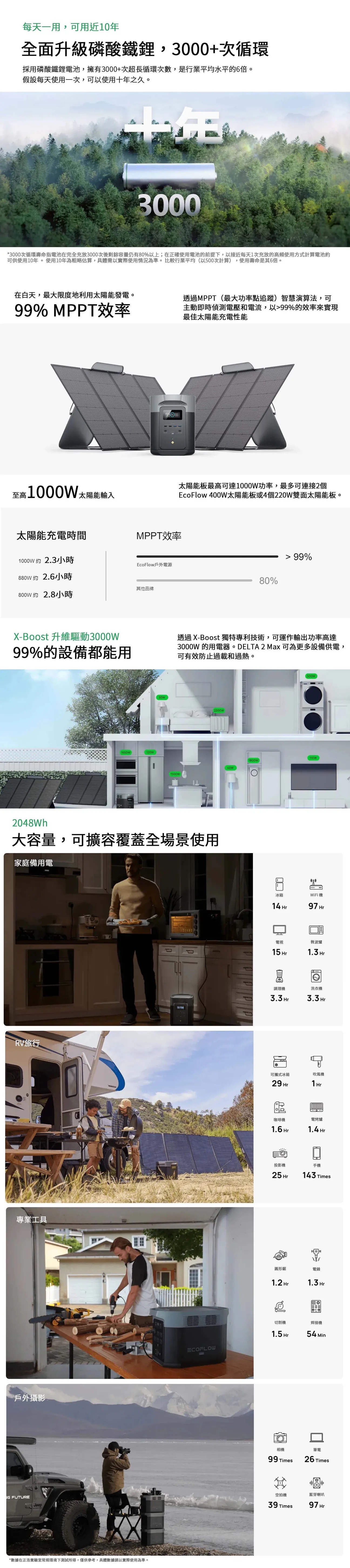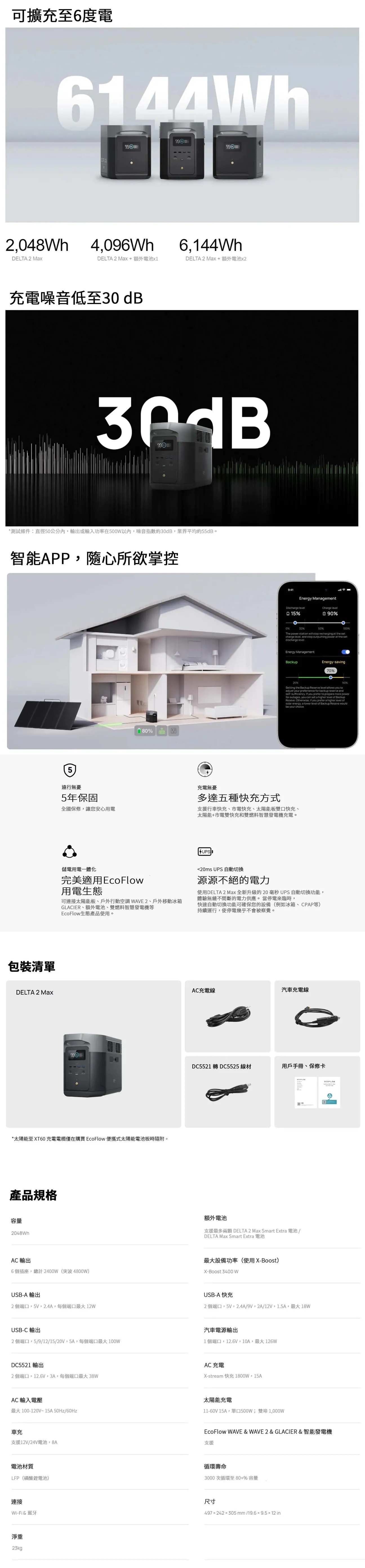 • 電池容量 2048Wh,搭配 DELTA 2 Max 額外電池以達到 6144Wh