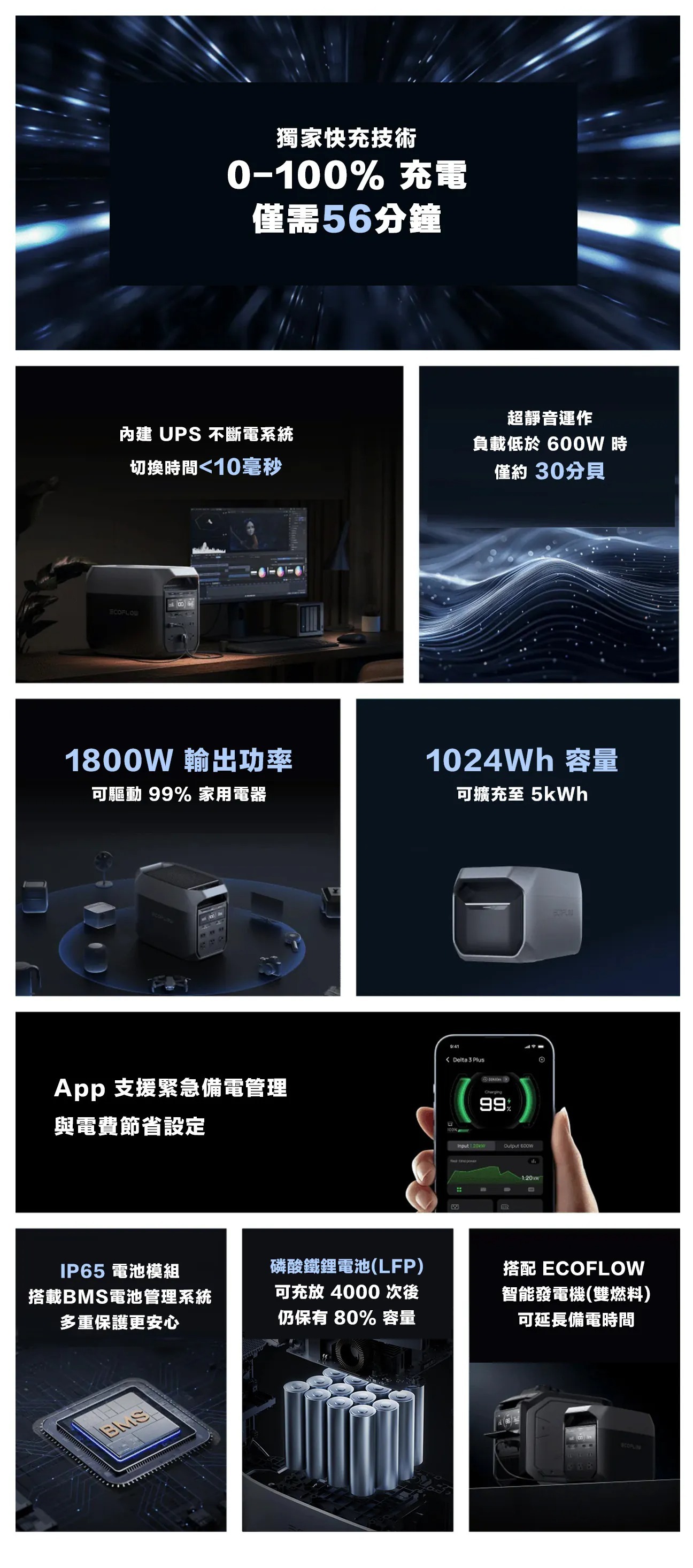 • 支援 5 種快速充電方式:市電、太陽能、800W 車用發電機、3000W 智慧發電機(雙燃料)、多元混合充電