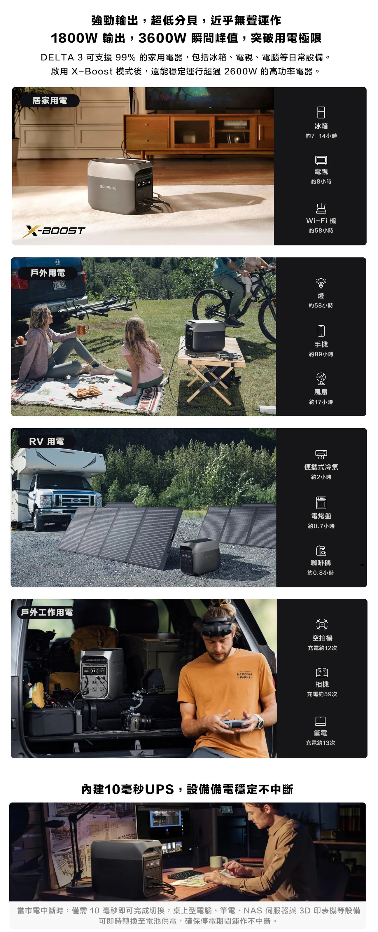 • 提供 1800W AC 輸出功率,啟用 X-Boost 模式可達 2200W(瞬間最大 3600W)