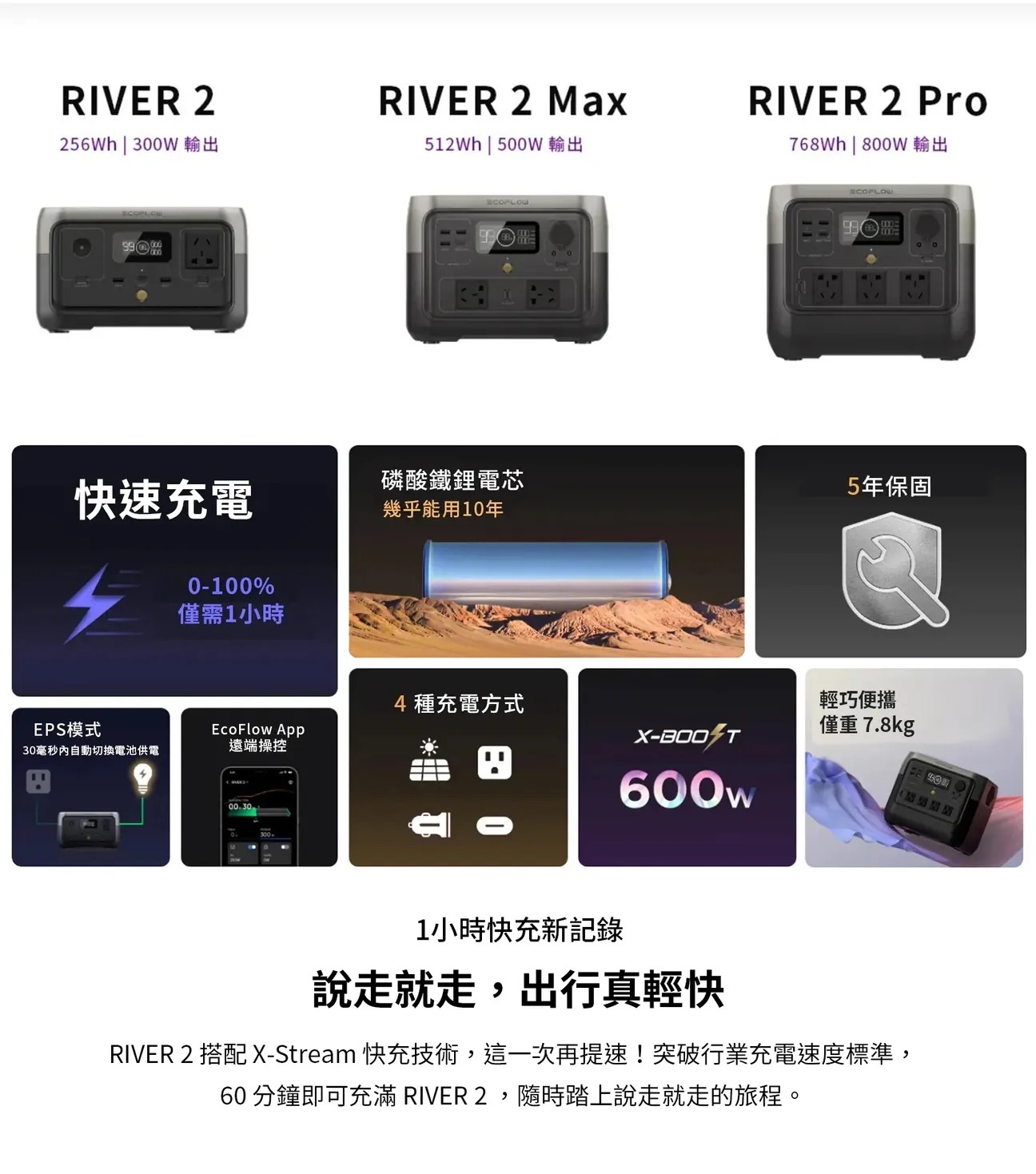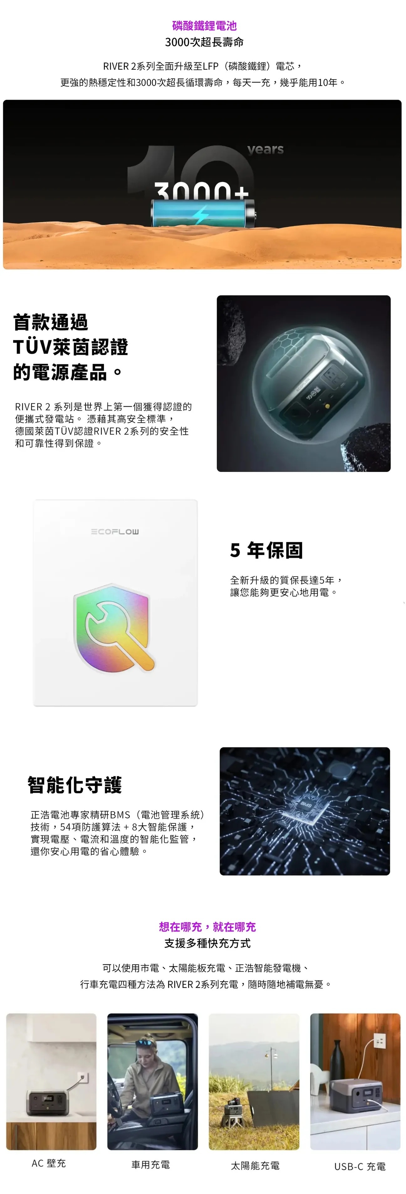 • RIVER 2系列全面升級至LFP(磷酸鐵鋰)電芯,更強的熱穩定性和3000次超長循環壽命,每天一充,幾乎能用10年。