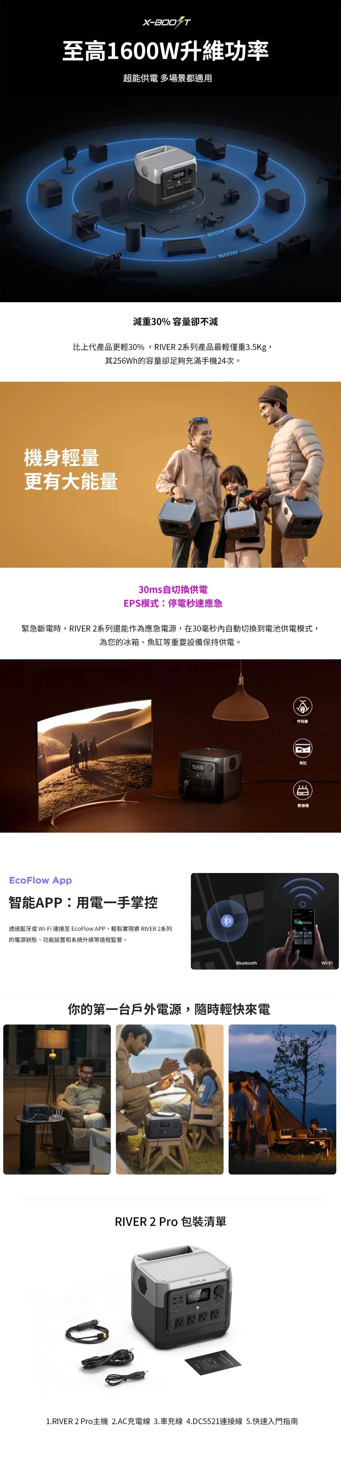 內容物:RIVER 2 Pro主機、AC充電線、車充線、DC5521連接線、快速入門指南