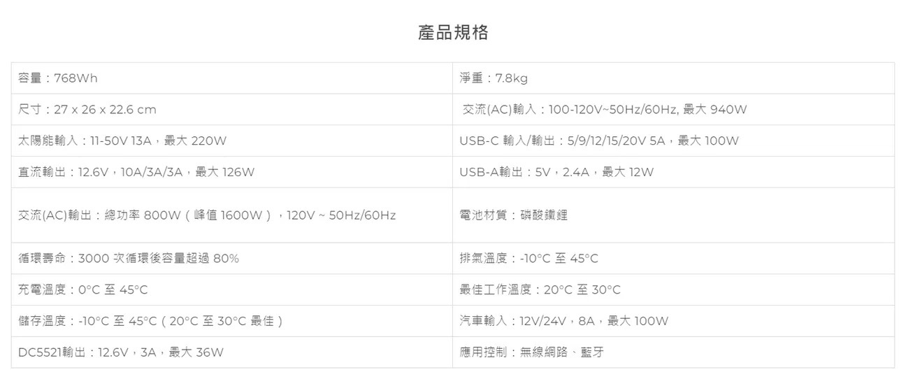 • 僅重7.8Kg | 768Wh容量 | 800W 輸出
