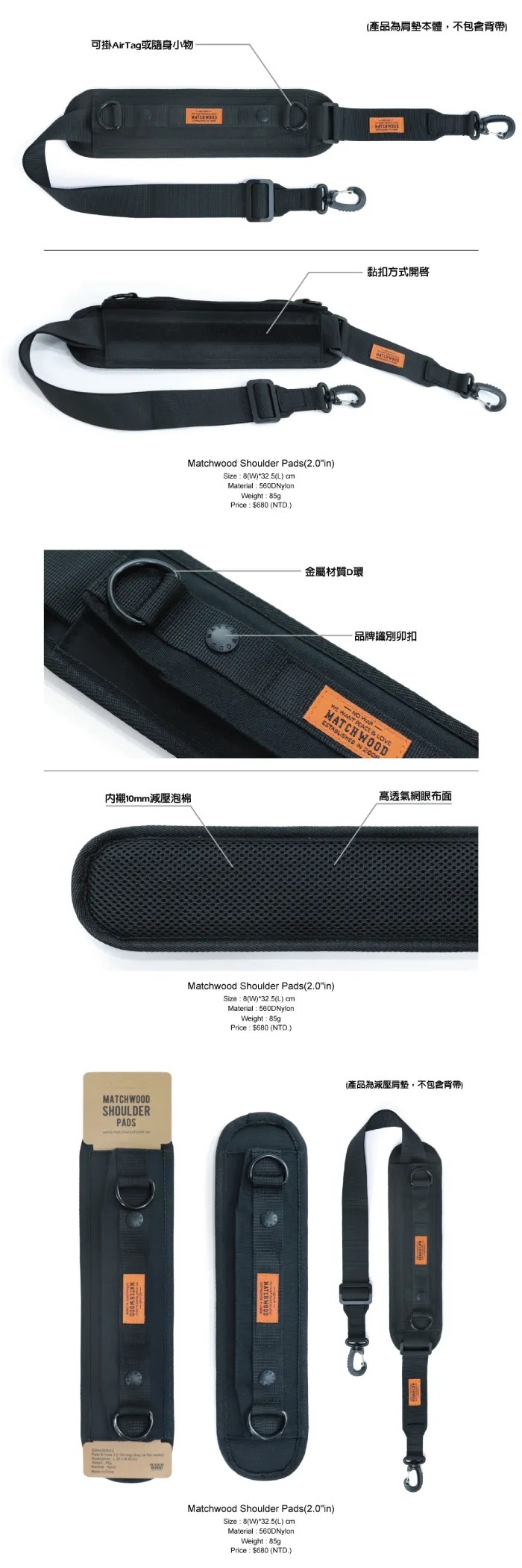 Matchwood釋出針對斜背中大包型款所使用的減壓肩墊,除了外型風格與包款一致外,內襯10mm減壓泡棉,不會太薄也不致過厚的適中厚度更能完美分散肩部壓力,與提供支撐的舒適程度。