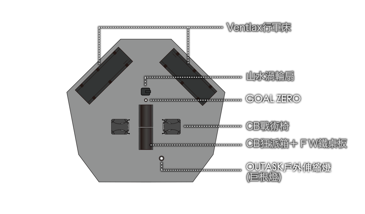 • ※ 僅帳篷本體與營柱:約 10kg(不含屋頂、營釘、營繩與收納袋)