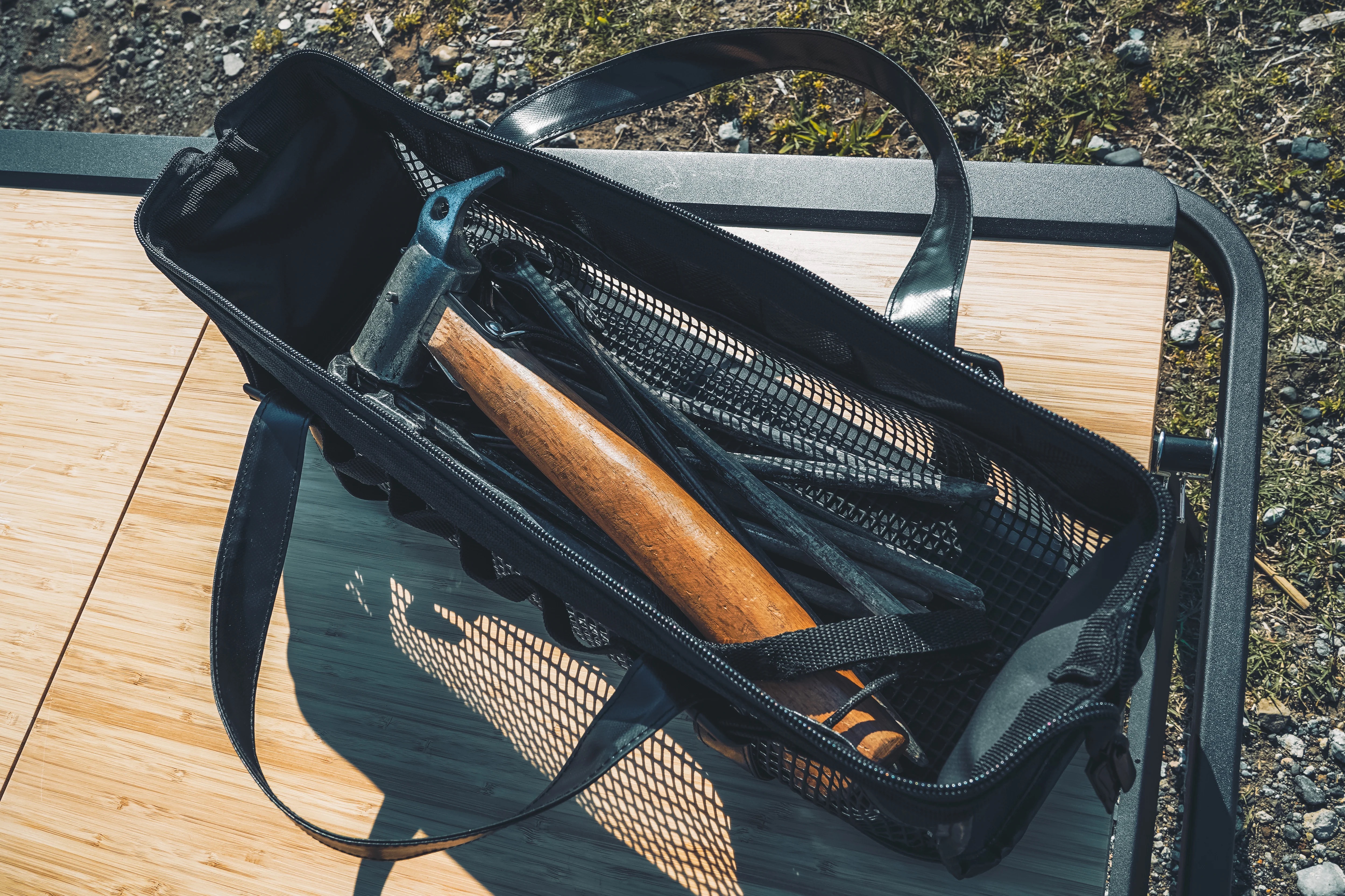 營釘和營錘可輕鬆放入或取出,開口硬挺,裝卸無壓力;最大可容納長達40公分的物品;適合收納營錘、營釘等小物品。