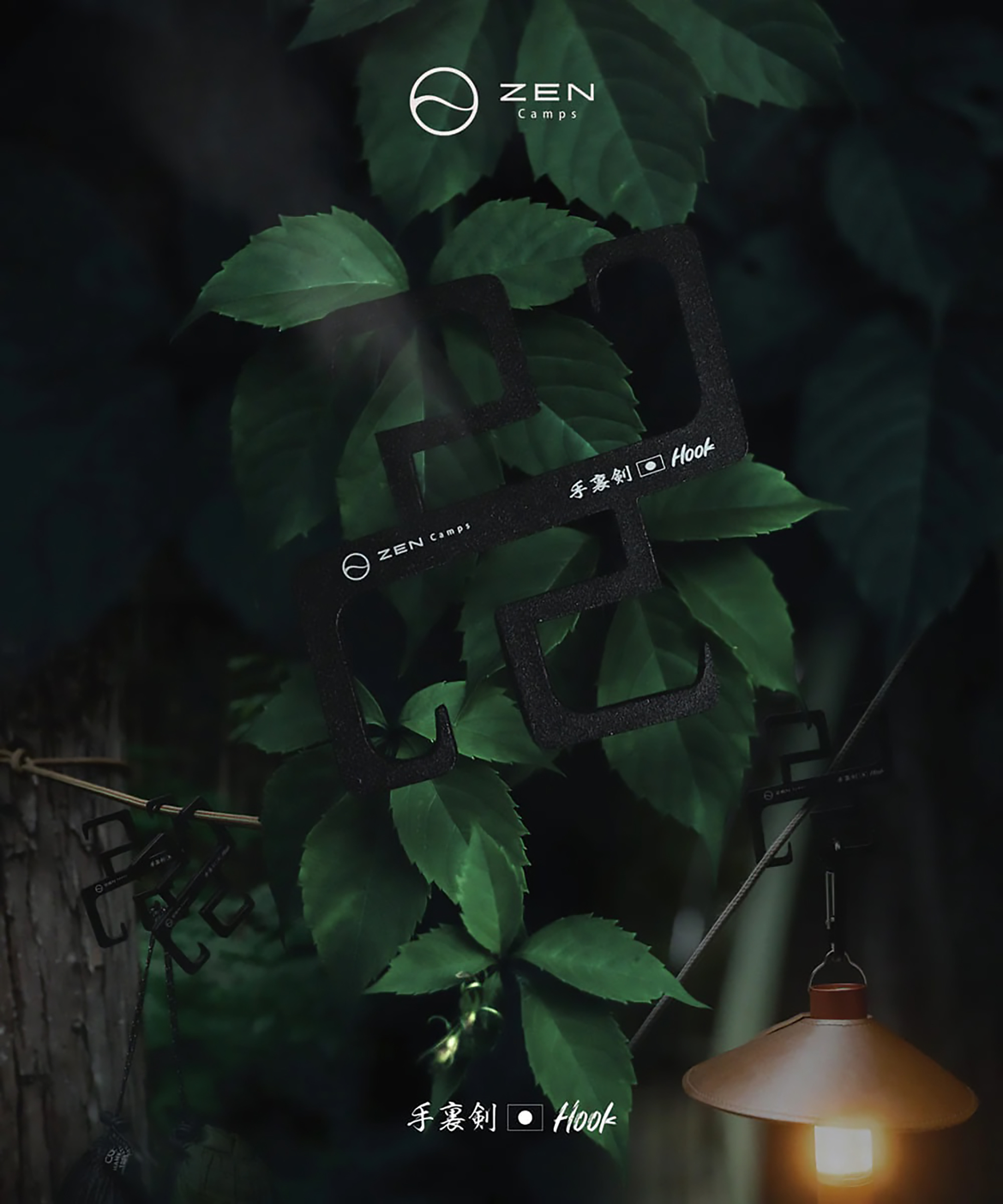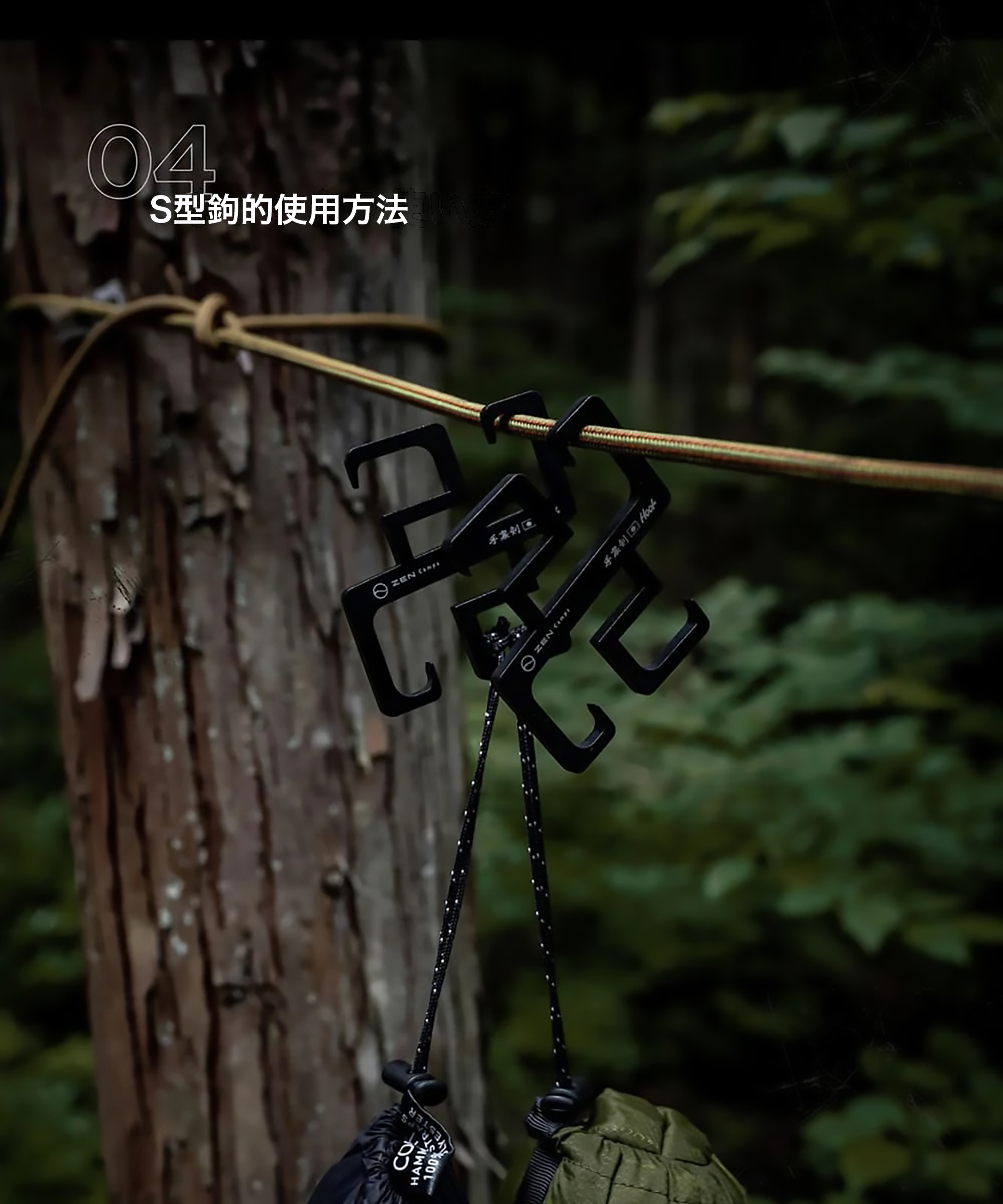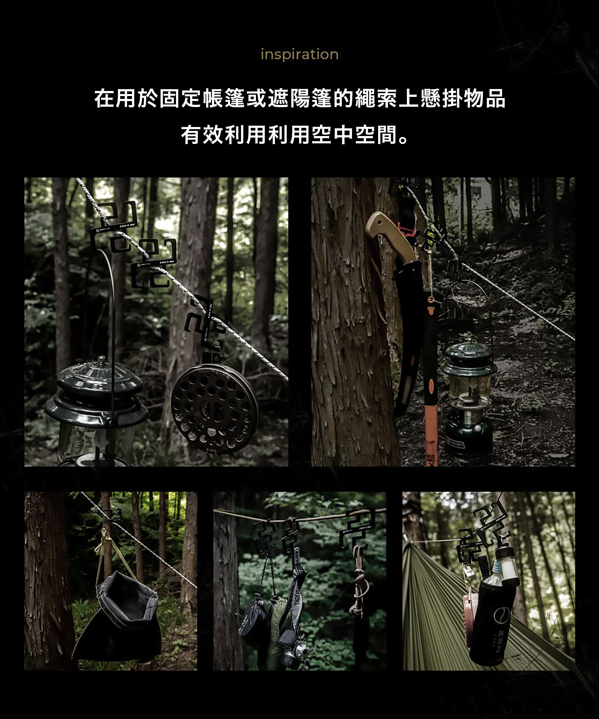 一個萬用的營繩掛鉤,可固定在帳篷或天幕的拉營繩上,或掛在桿子上以懸掛露營設備。它的創作靈感來自忍者手裏劍的形狀。