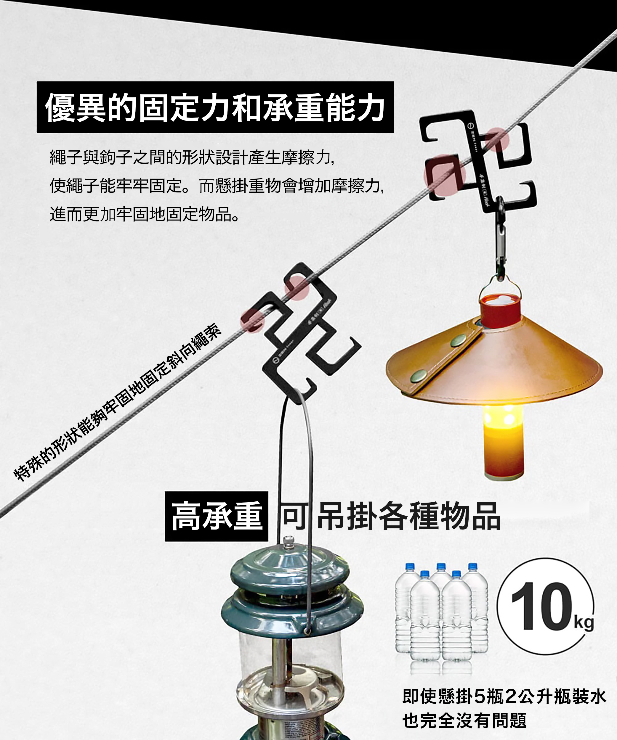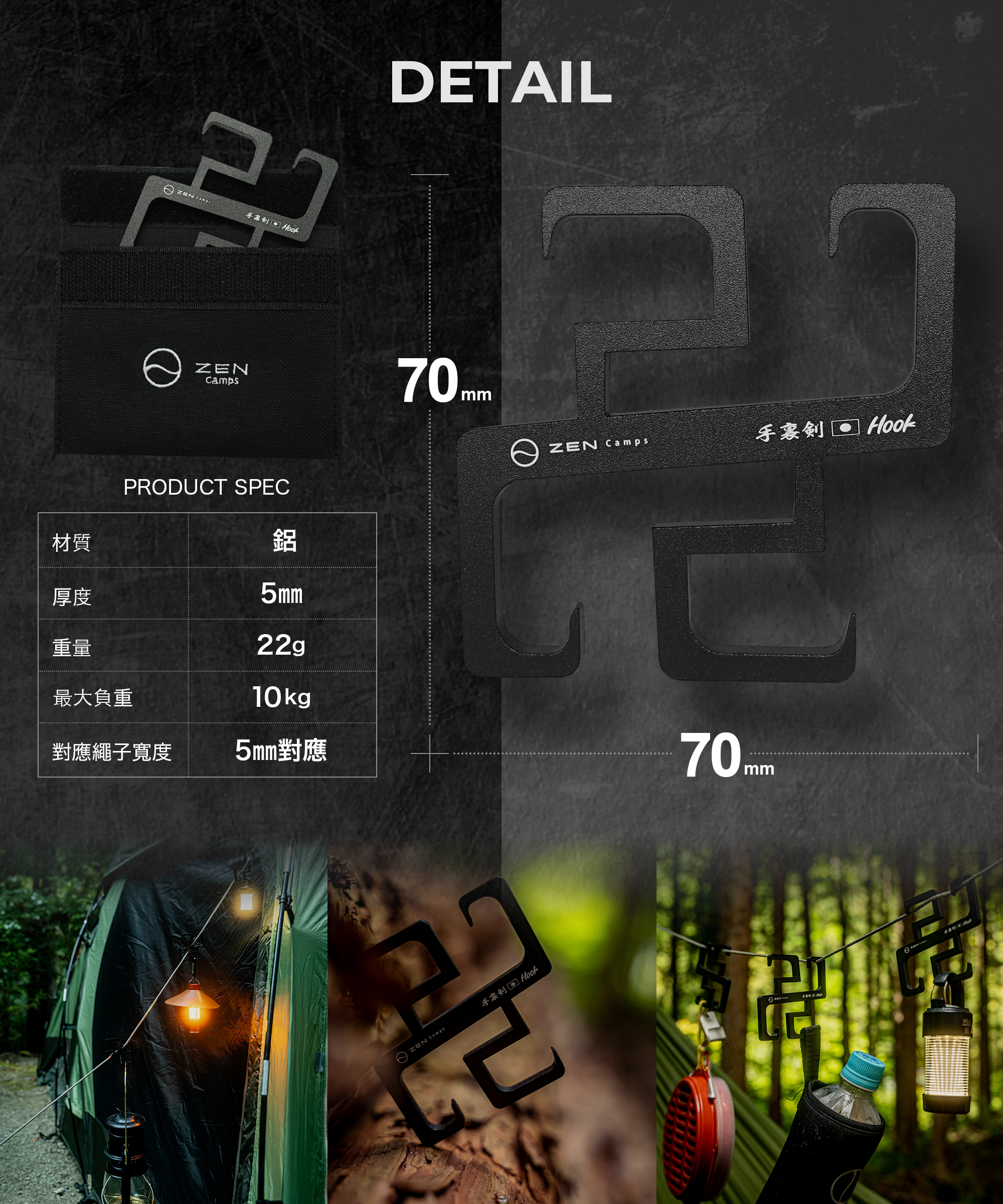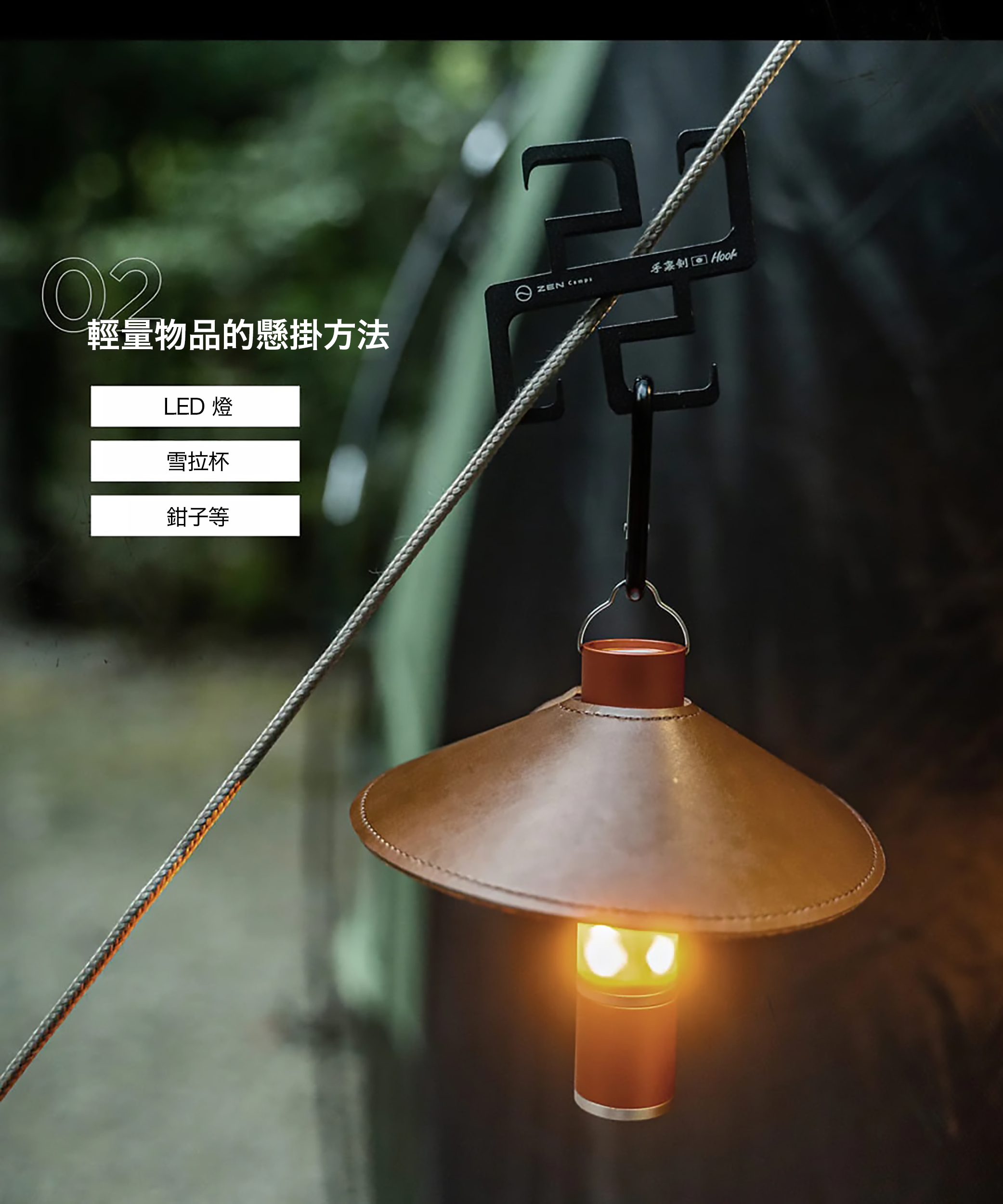 一個萬用的營繩掛鉤,可固定在帳篷或天幕的拉營繩上,或掛在桿子上以懸掛露營設備。它的創作靈感來自忍者手裏劍的形狀。