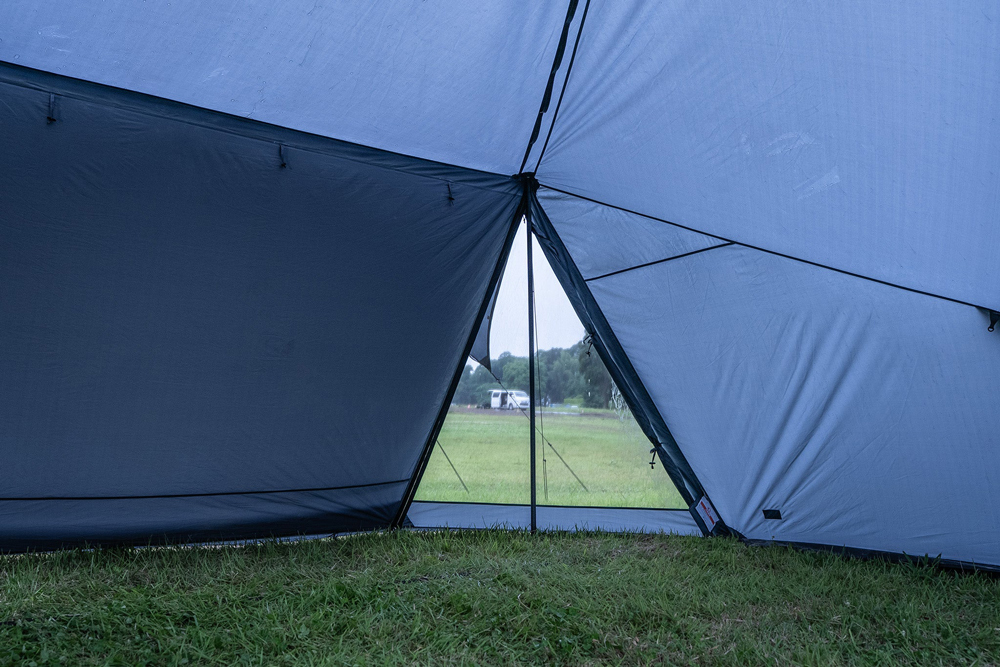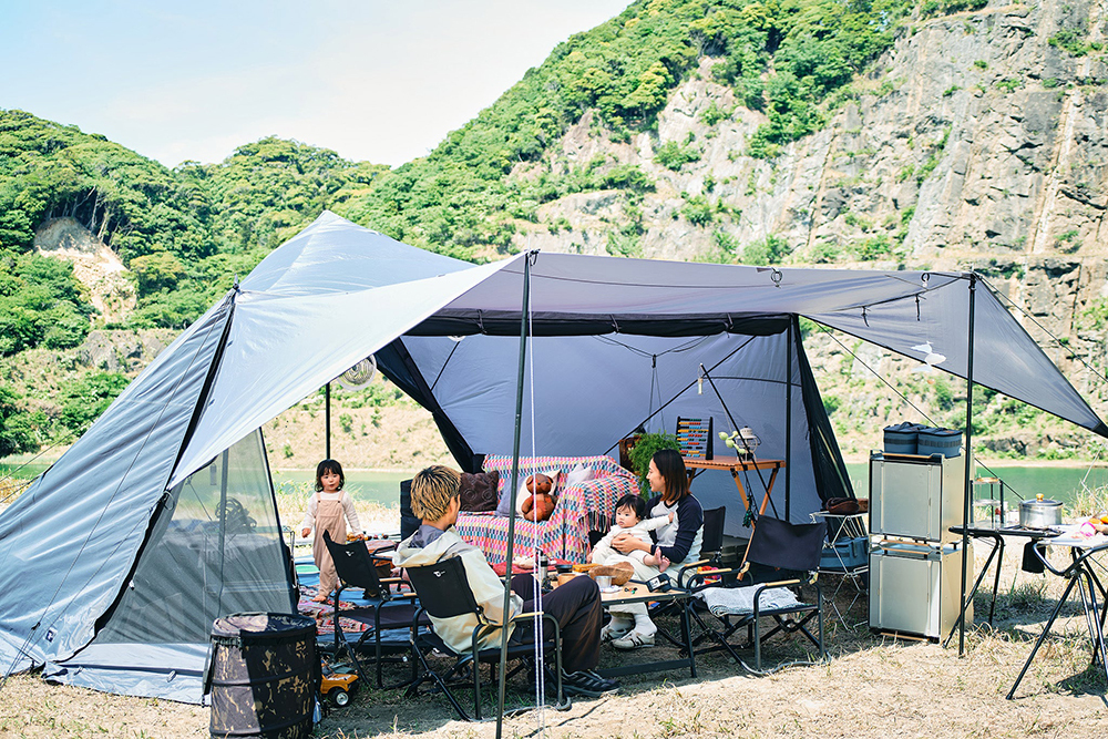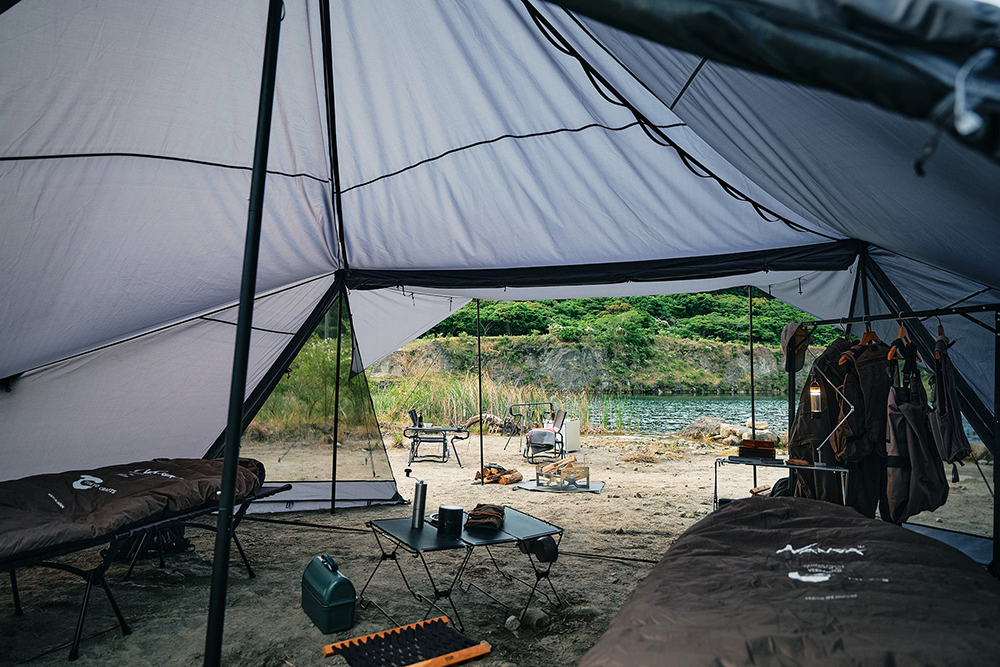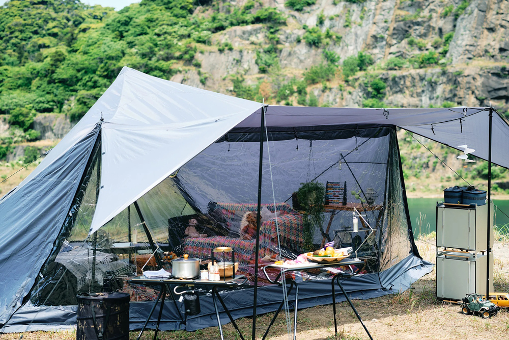 帳篷正面配置了搭載大型網窗,並結合免天幕式前庭的設計,可依照天候狀況靈活調整空間型態。