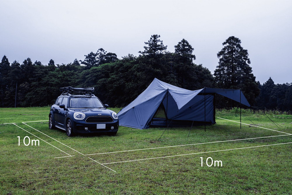 在前庭撐起的狀態下,即使包含拉繩與車輛,也能完整收納於 10m × 10m 的標準營位中。