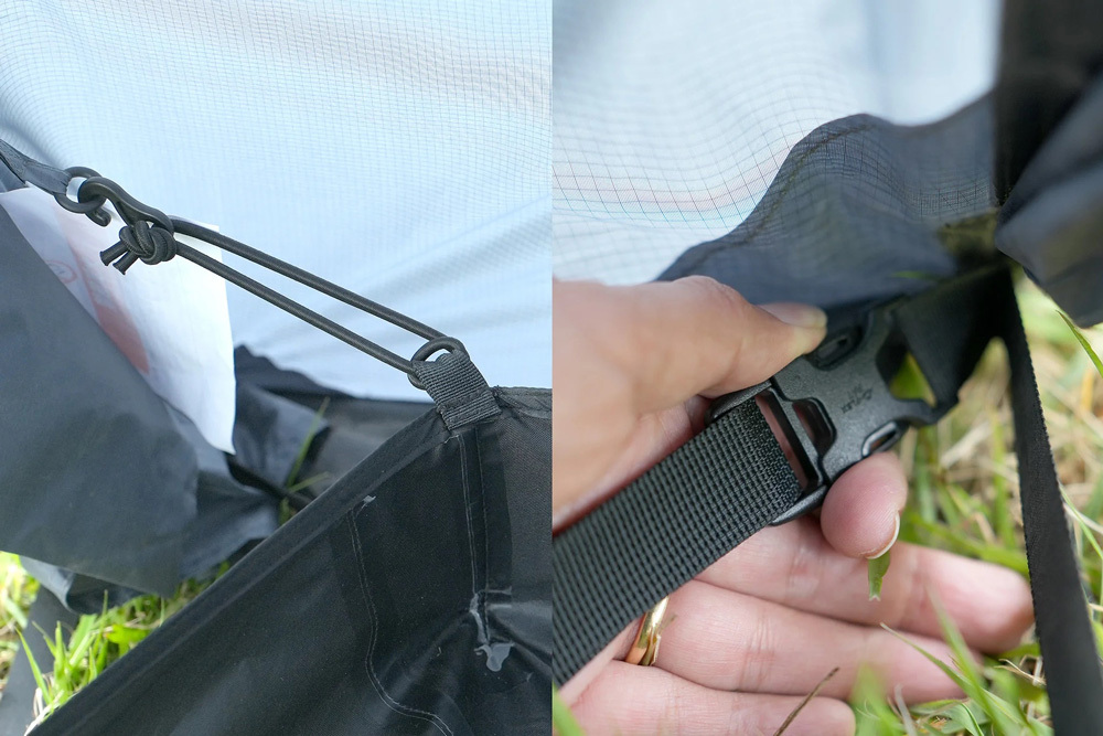 附有兩條吊掛織帶,可懸掛 LED 燈、毛巾等小物,提升帳內使用便利性。