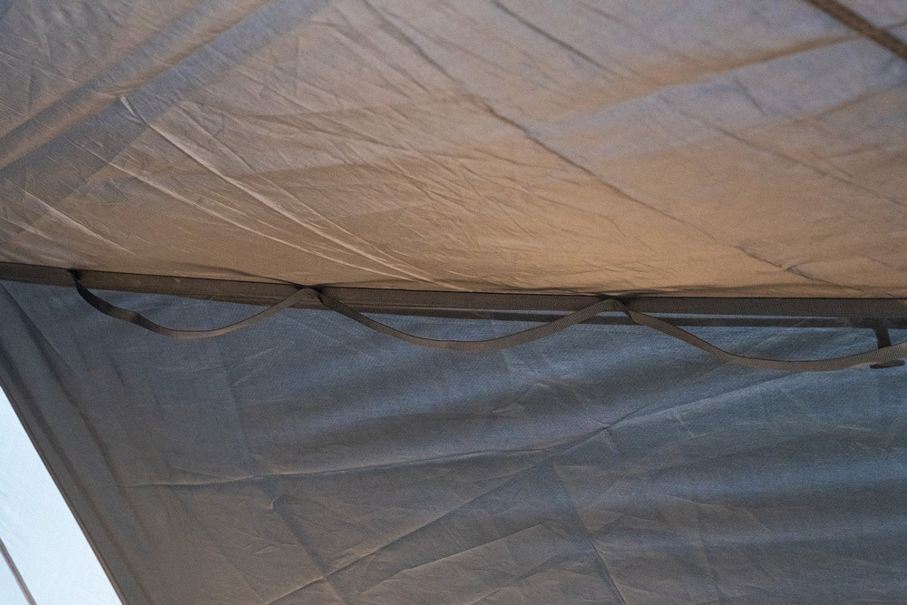 黑色布料可有效抑制陽光與眩光,在帳內形成柔和陰影。即使是高挑帳篷,也能透過內側掛勾輕鬆安裝。※非完全遮光設計。