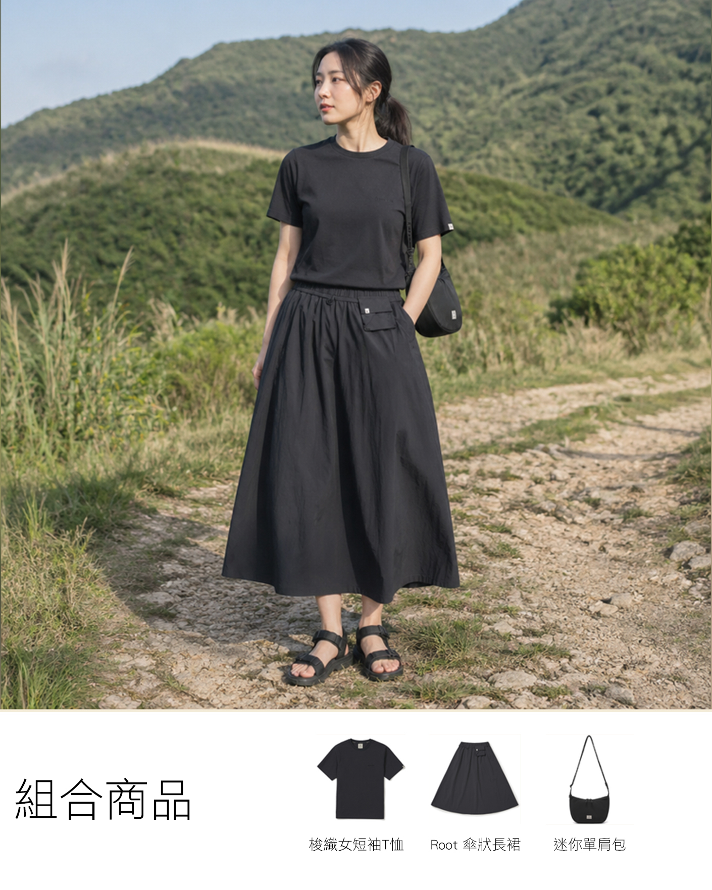 推薦組合:梭織女短袖T恤+Root 傘狀長裙+迷你單肩包