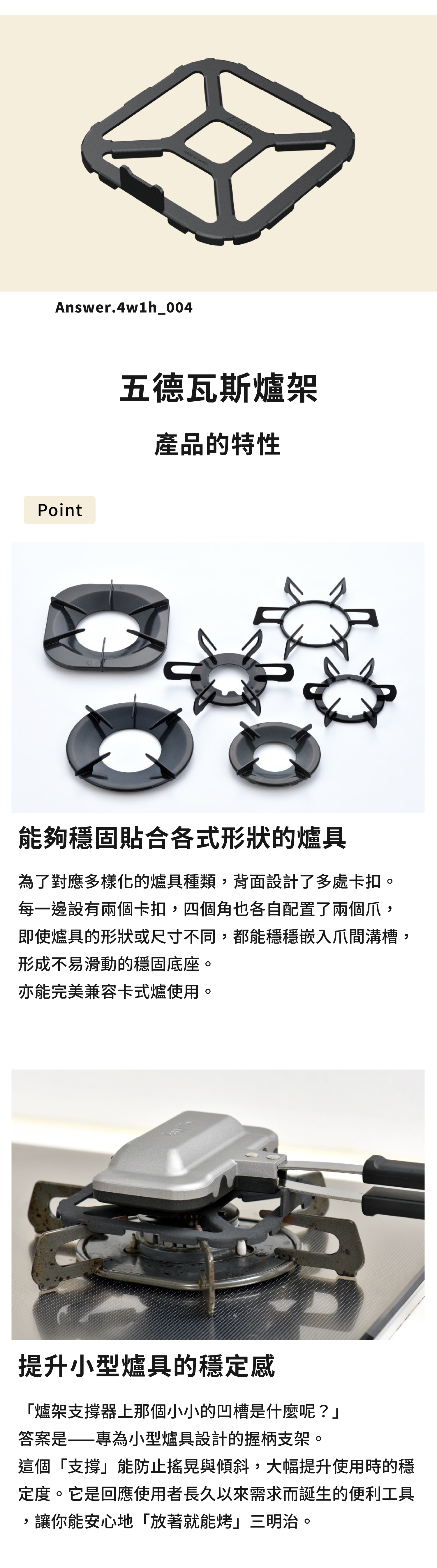 專為小型鍋具與露營調理器具設計的「五德瓦斯爐架」,能穩固貼合各式爐具形狀與尺寸,