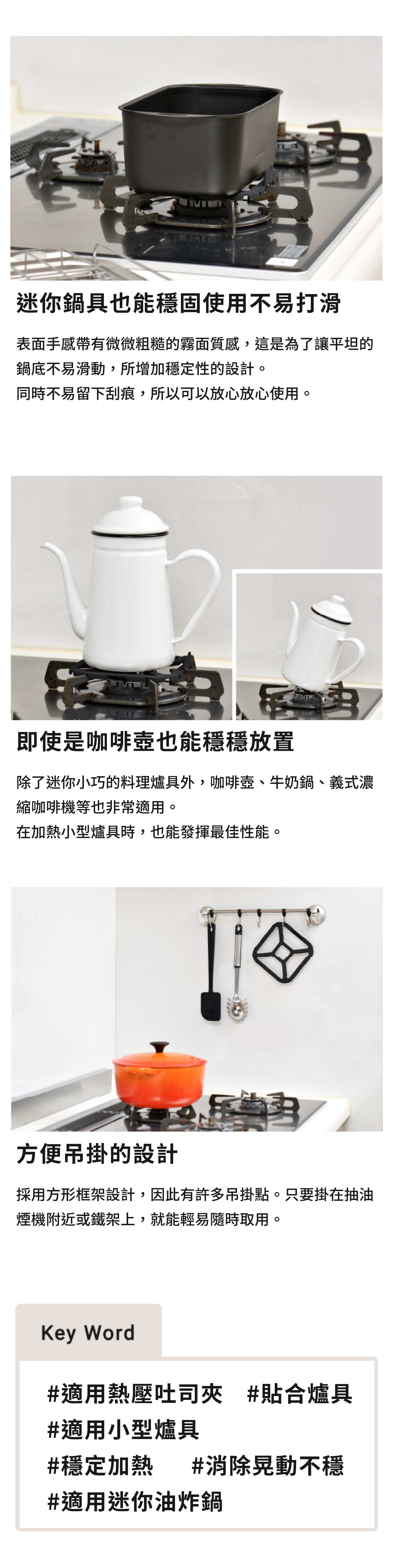 適用熱壓吐司夾、咖啡壺、迷你油炸鍋等各式小鍋具。